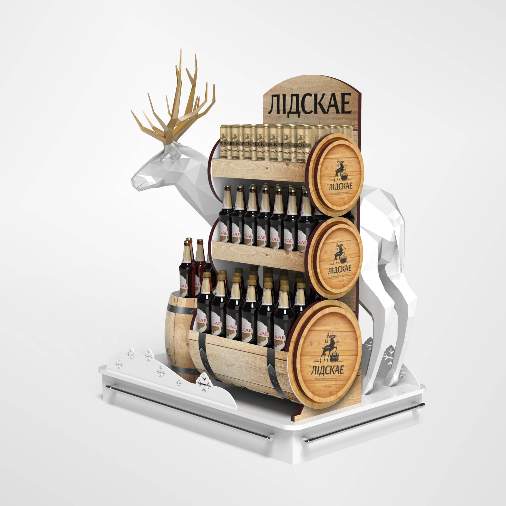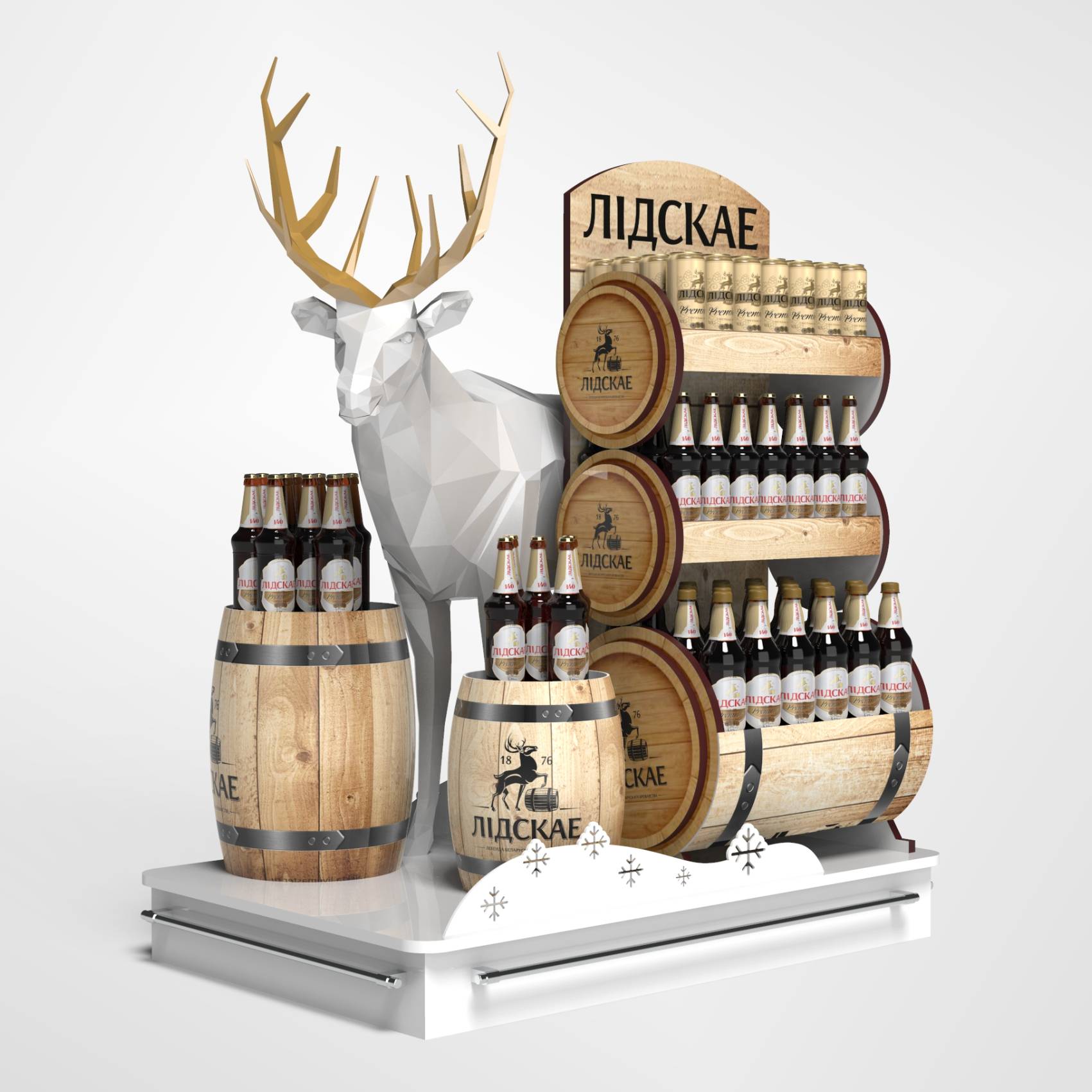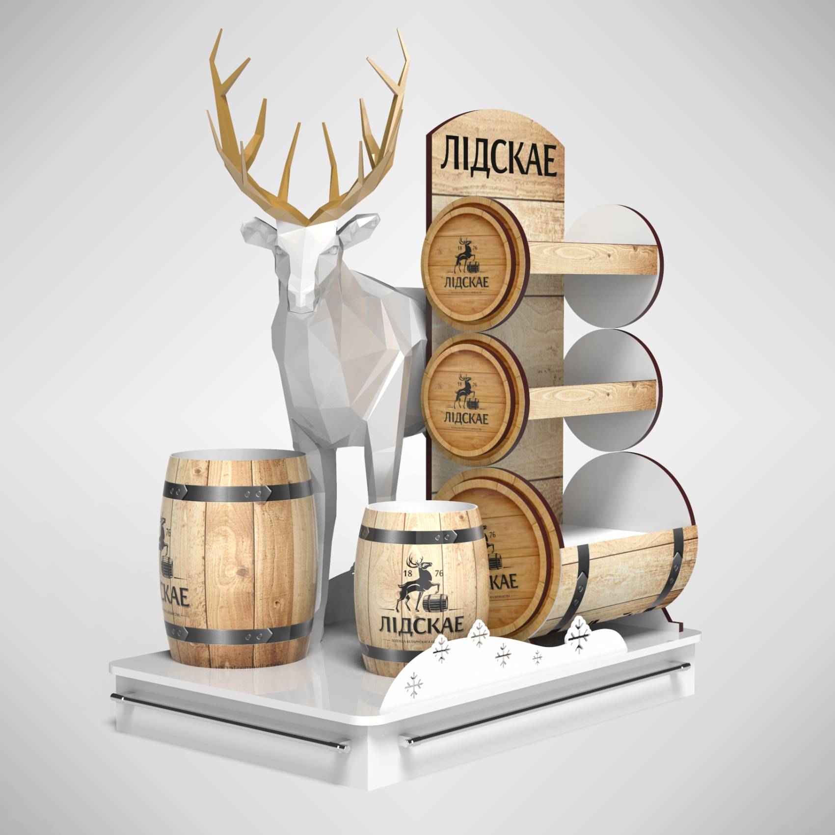ДМП может сочетать в себе и функцию театрализации. Стойка для товара из массива, тонировка, гравировка логотипа. Бочки с металлическими ободами. Олень - пенопластовая фигура с покраской.