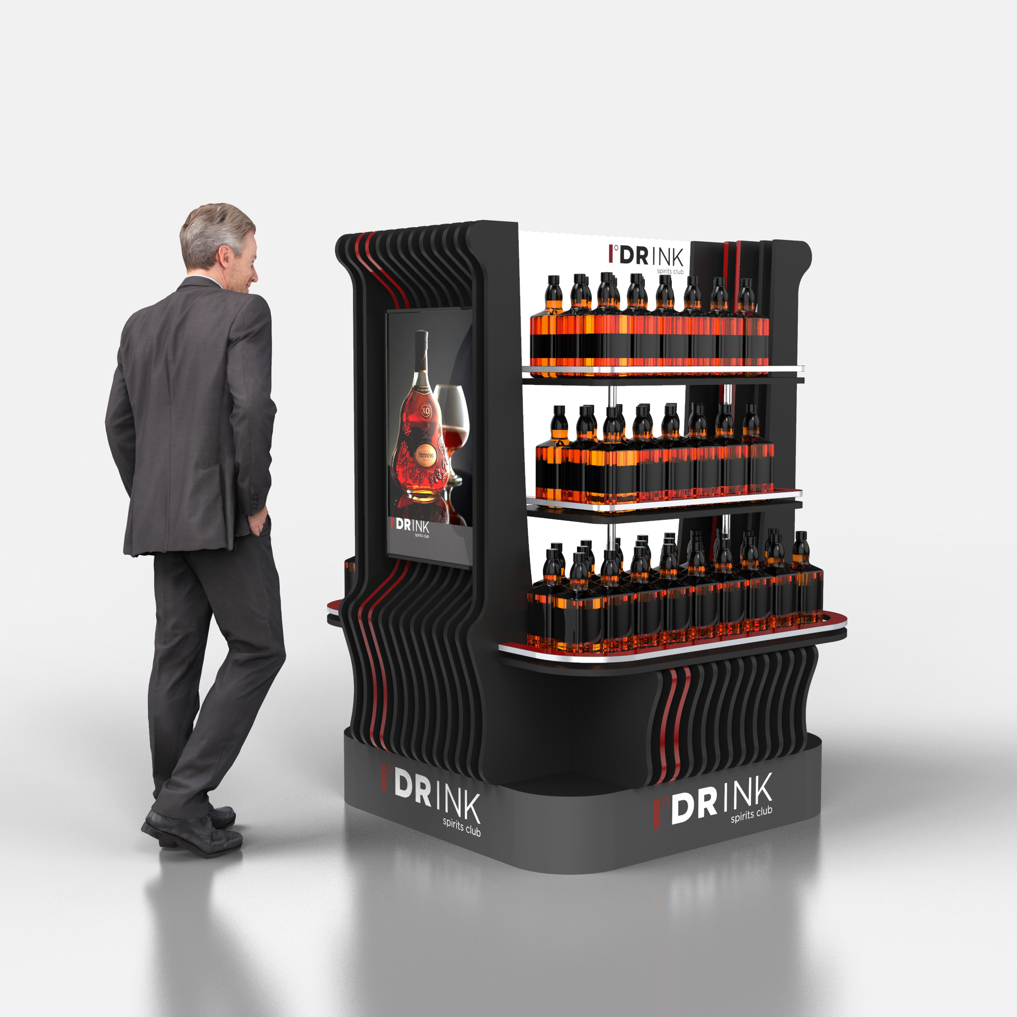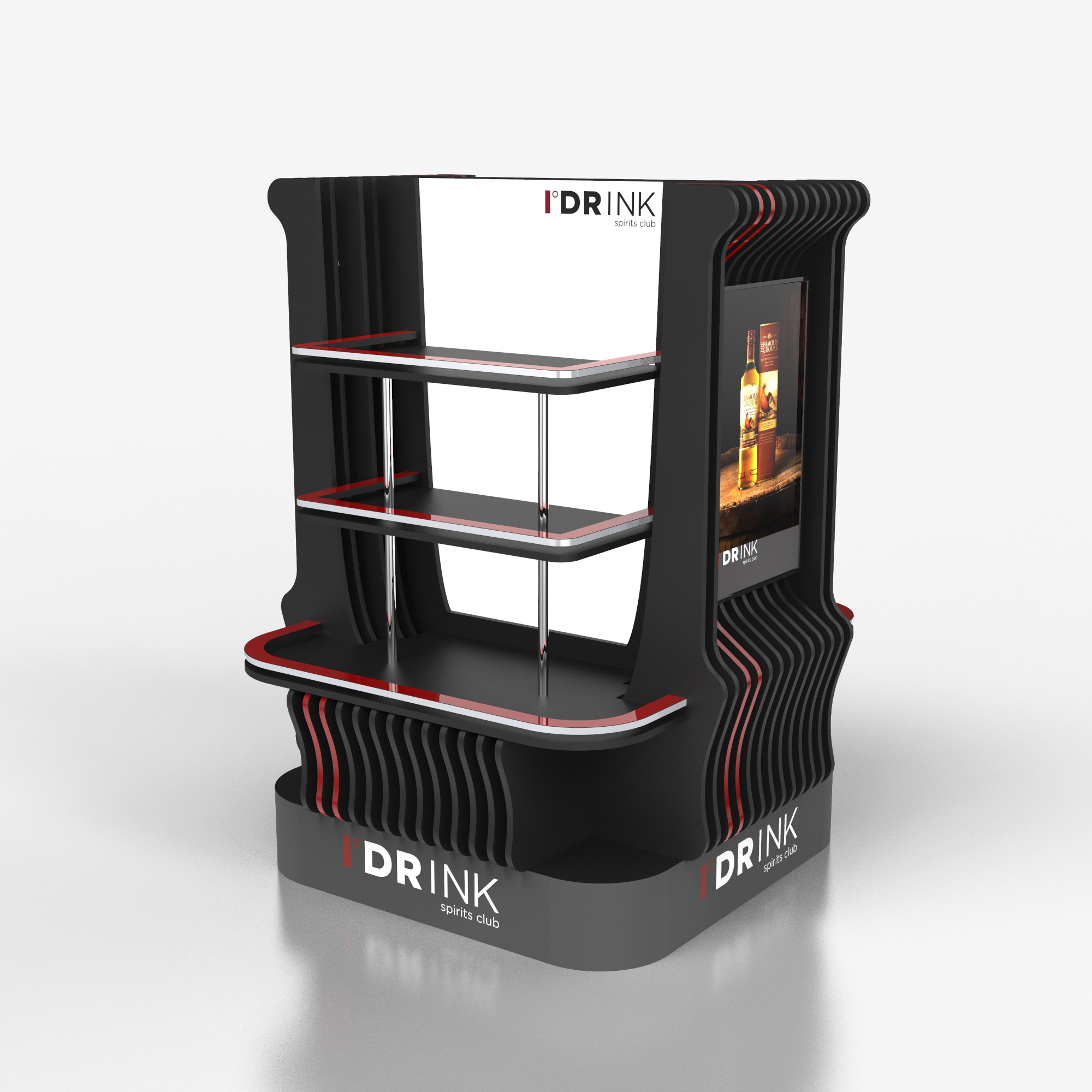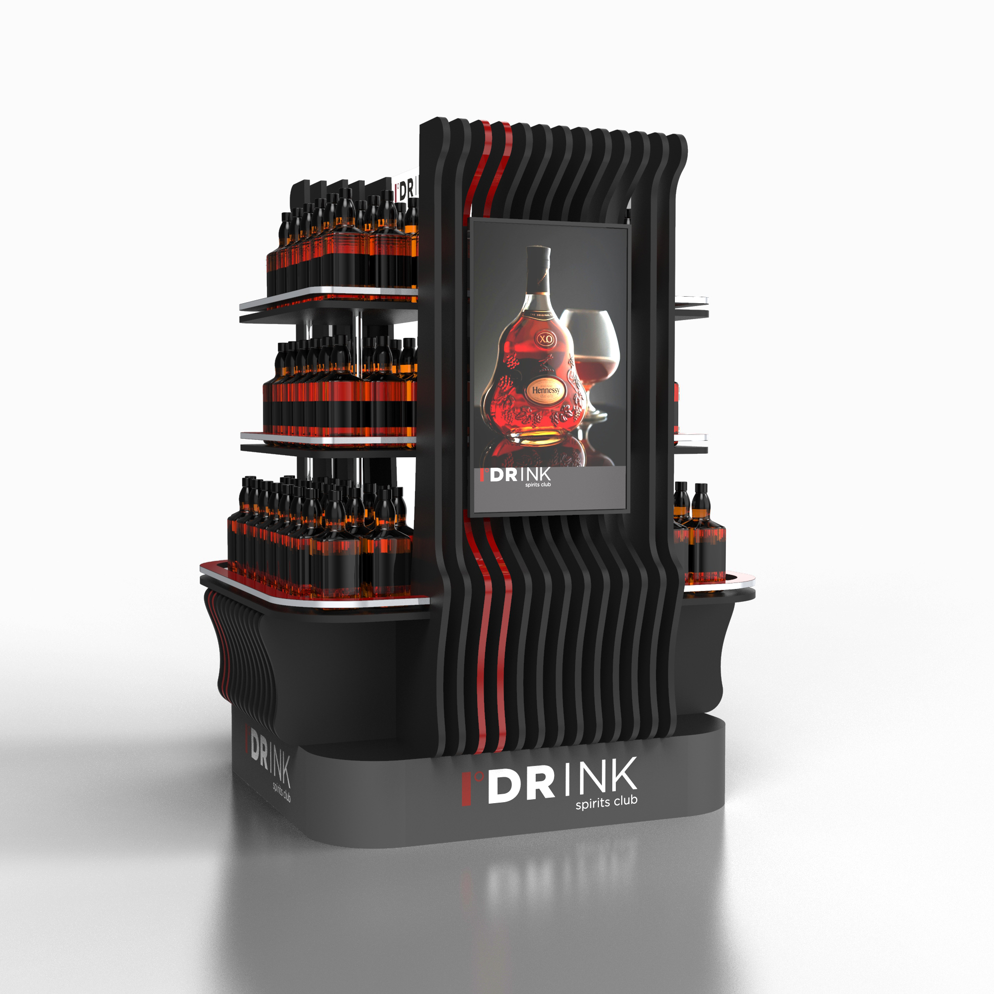 Стойка для выкладки товара мультибрендового формата. Заказчик является крупнейшим импортером премиального алкоголя в РБ, поэтому концепт данной стойки включал в себя использование высококачественных материалов и интерактивной панели.